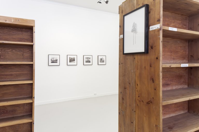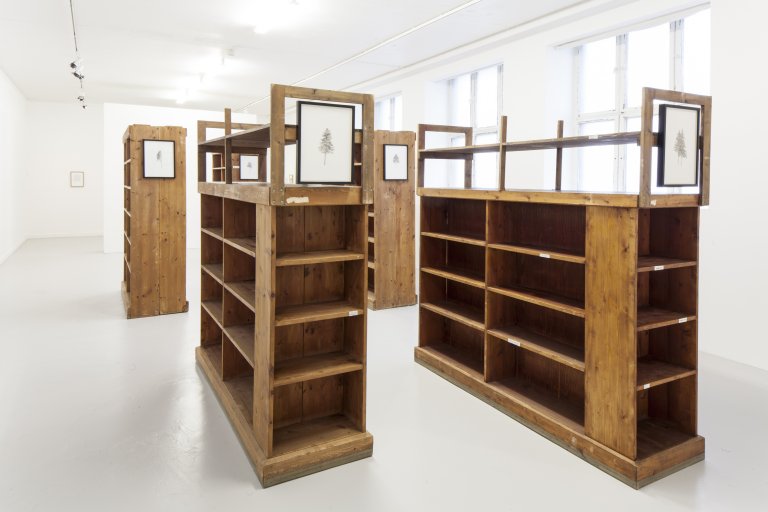 Installation view "Ann Böttcher – Transmigrations (Bookshelves, a cannon emplacement and a Mercedes)", Galerie Nordenhake Stockholm 2014