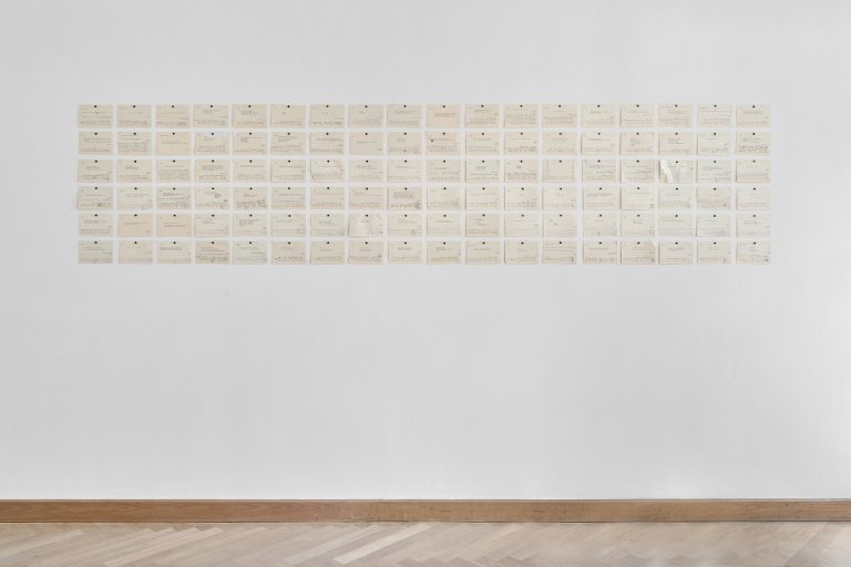108 postkartlz [108 postcard], 2025, ink on paper, thumbtacks, overall: 110 x 210 cm