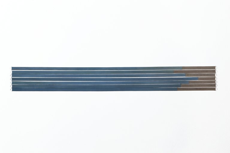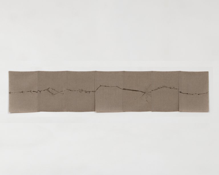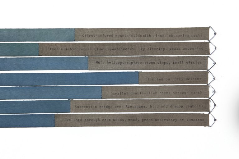 Hourly field notes, 10 October, Dakesawa, 2012, ink on cotton, 7 sections, each 16 mm x 1 mm