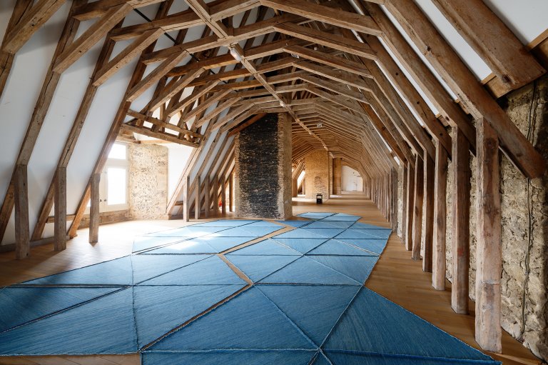 Installation view, Sky-wreck 1/22, 2001, handwoven indigo dyed cotton, Château de Rochechouart, France, 2022. Photo Aurélien Mole.