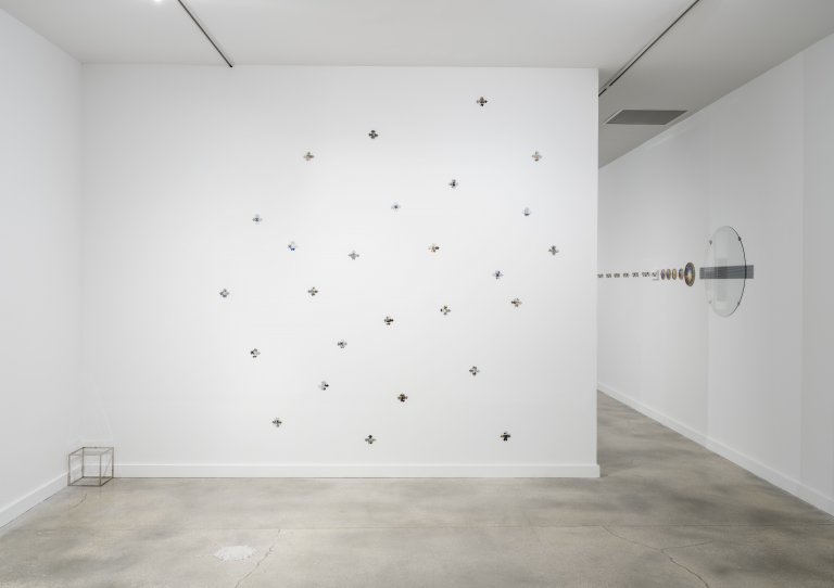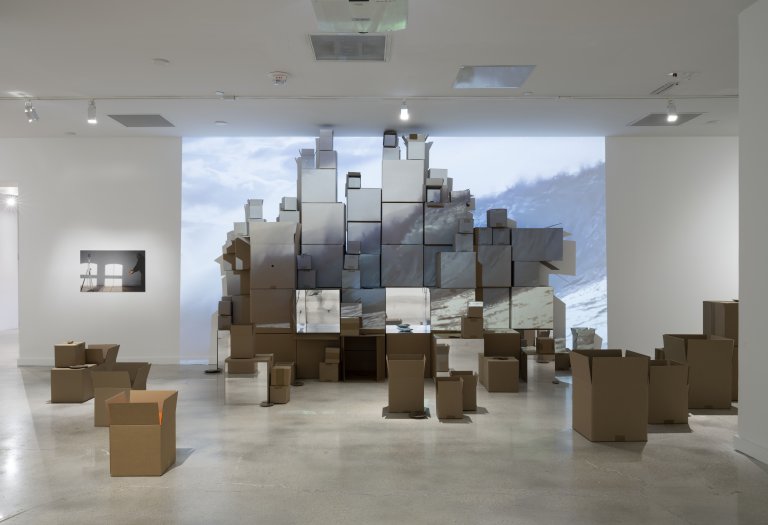 Hulduklettur, 2017, Cardboard boxes, mirrored aludibond, anatomical model of inner ear, wood, fossile ammonites, Swarovski crystals, Inkjet-print mounted on aludibond, C-prints framed, video projection, dimensions variable, installation view, Galerie Nordenhake, Berlin 2017