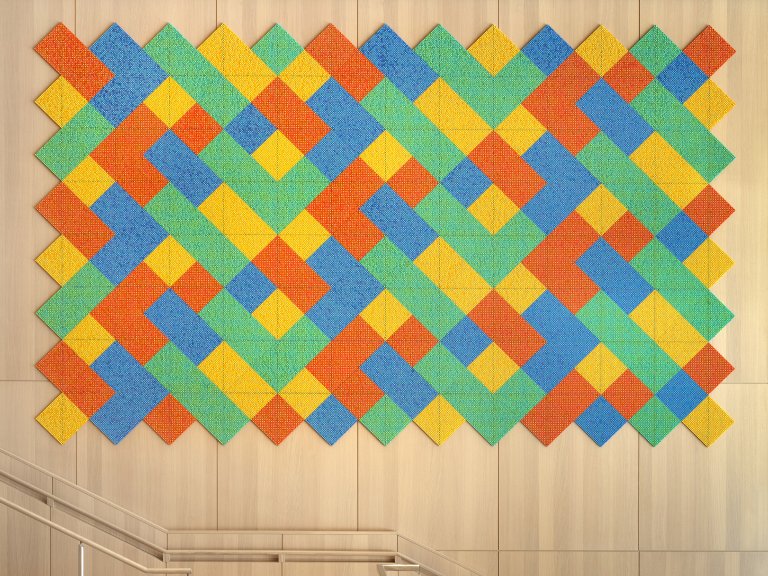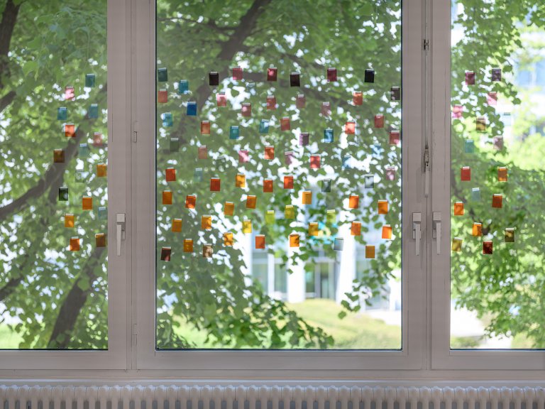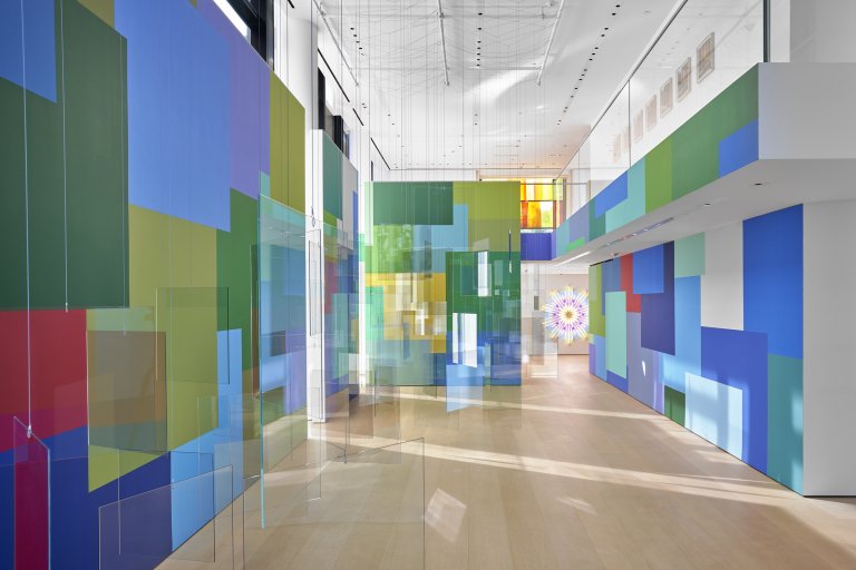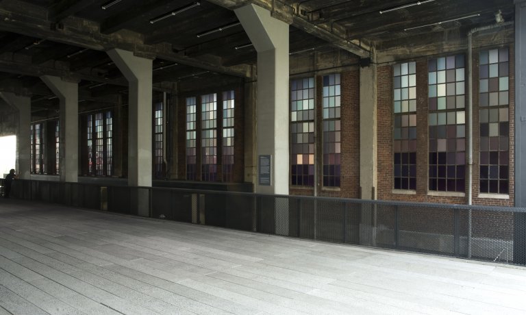 The River that Flows Both Ways, 2009, Transforms an existing series of windows with 700 individual panes of glass representing the water conditions on the Hudson River over a period of 700 minutes in a single day
