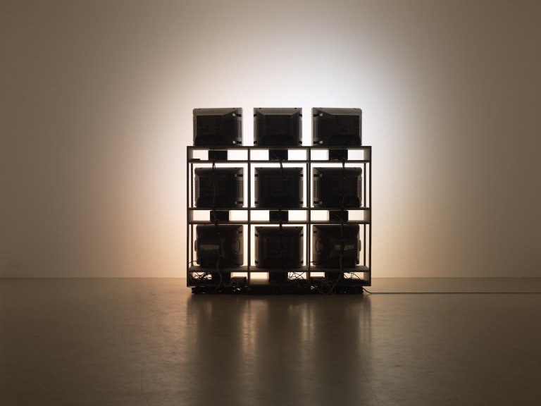 West (Sunset in my motel room, Monument Valley, January 26, 2007, 5:36-6:06 pm), 2007, 9-channel synchronized video installation with 9 TV monitors, 9 DVD players and sync unit, Running time: 31 min, 5 sec, Dimensions variable, shelving and monitors: 182 x 206 x 73,7 cm, 71 10/16 x 81 1/16 x 29 1/16 in