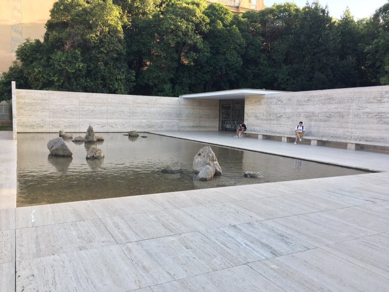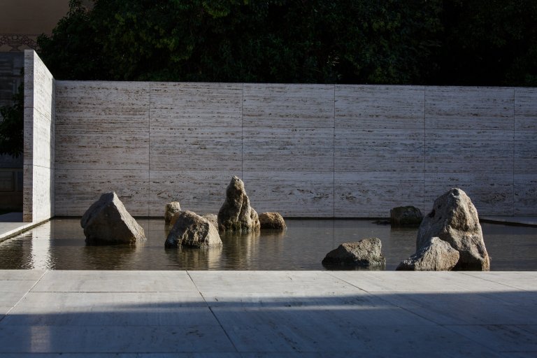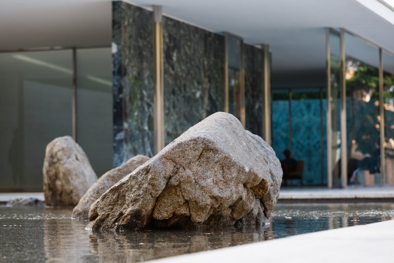 Fifteen Stones (Ryōan-ji), 2018, 15 granite stones, site-specific installation for the reflecting pool, Mies van der Rohe Pavilion, Barcelona, photo: Anna Mas