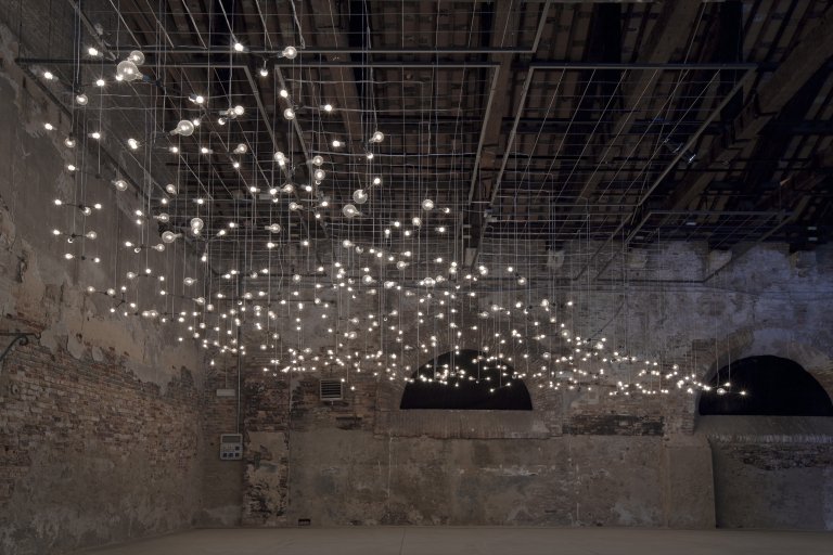 Installation view "Spencer Finch – Moondust (Apollo 17)", Venice Biennale 2009, 150 light fixtures and 417 incandescent light bulbs, dimensions variable, Fare Mondi/Making Worlds