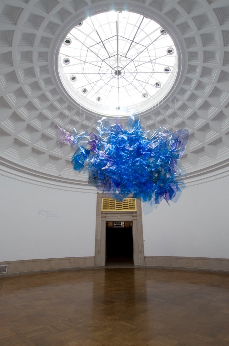 Installation view "Spencer Finch – Passing Cloud", Corcoran Gallery of Art, Washington D.C. 2010, Fluorescent light fixtures and lamps, filters, mono-filament, and clothespins, dimension variable