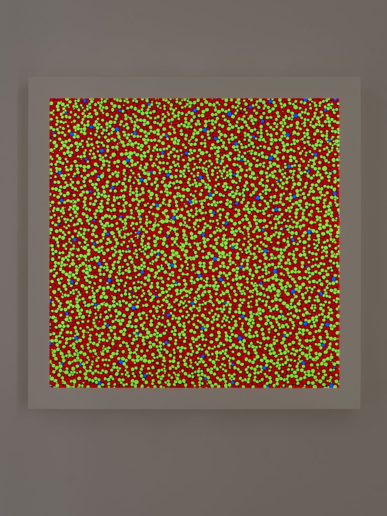 After La Grande Jatte (Spectrophotometric #3: trumpeter’s hat, girl’s hair, grass in sun, monkey), 2023, acrylic on birch plywood panel, one from group of three paintings, each 50.8 x 50.8 cm, 20 x 20 in