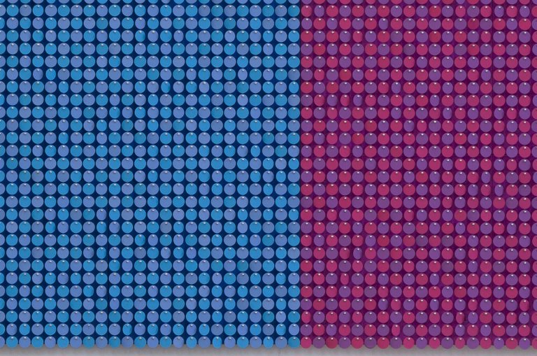 Study for Six Unnameable Colors, 2023, automotive paint, stainless steel discs, ABS plastic mounted to Komatex, 182.9 x 30.5 cm, 72 x 12 in, detail