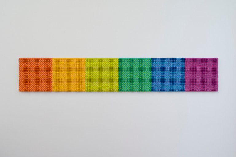 Study for Six Unnameable Colors, 2023, automotive paint, stainless steel discs, ABS plastic mounted to Komatex, 182.9 x 30.5 cm, 72 x 12 in