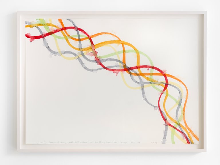 Gutter (San Francisco) straw, cigarette butt, feather, cucumber slice, banana peel, syringe, coffee cup, 2019, watercolour on paper, 53 x 74.5 cm, 20 3/4 x 29 1/4 in, framed 82 x 61 cm, 32 1/4 x 24 in