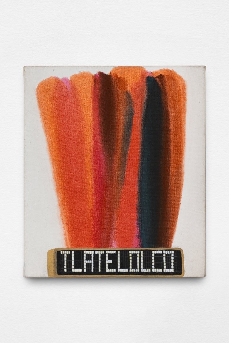 Dalwood’s paintings are full of these connections: historical and social moments intertwined with direct references to art history. In Tlatelolco, we encounter the iconic scoreboard of the Estadio Olímpico Universitario, used during the 1968 Mexico City Olympics. In this version, the screen no longer shows competition results but instead the name of this area of the city, which, since October 2, 1968, has become synonymous with the repression of student protests. In the background appears a reference to the work of American painter Morris Louis, a leading figure of Color Field Painting, whose influence still resonates today.