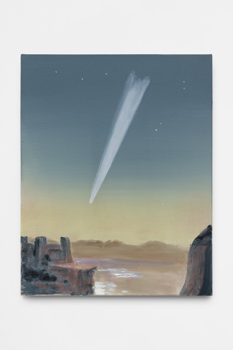 Moctezuma watching a comet from the roof of his palace in Tenochtitlán that José María Velasco would paint 400 years later, 2025, oil on canvas, 35 x 25 cm, 13 3/4 x 9 7/8 in