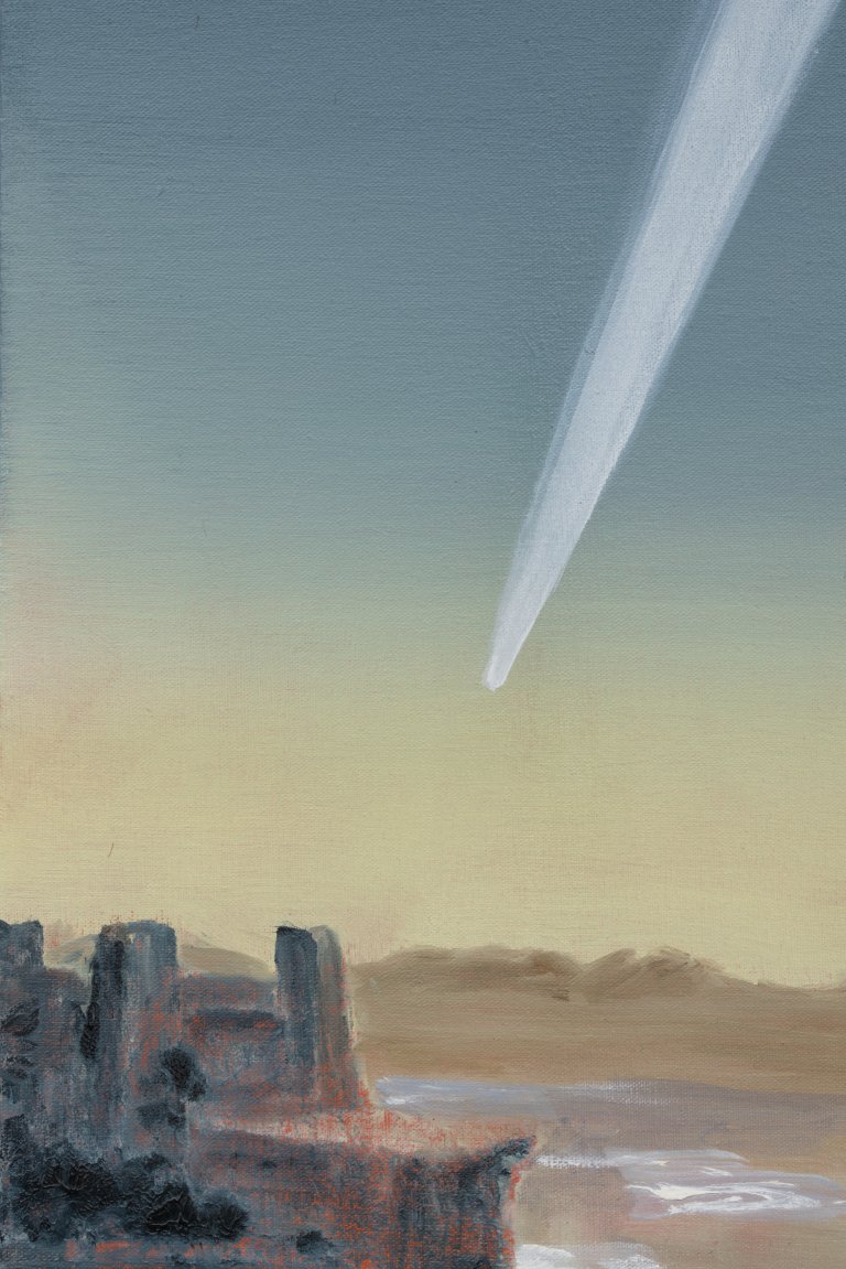 (detail) Moctezuma watching a comet from the roof of his palace in Tenochtitlán that José María Velasco would paint 400 years later, 2025, oil on canvas, 35 x 25 cm, 13 3/4 x 9 7/8 in.